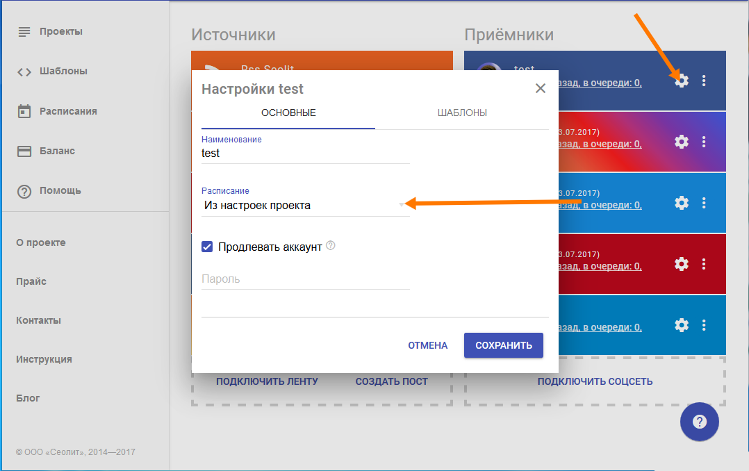 В графе «Расписание» оставляем вариант «Из настроек проекта», если вы не планируете подключать отложенный постинг.