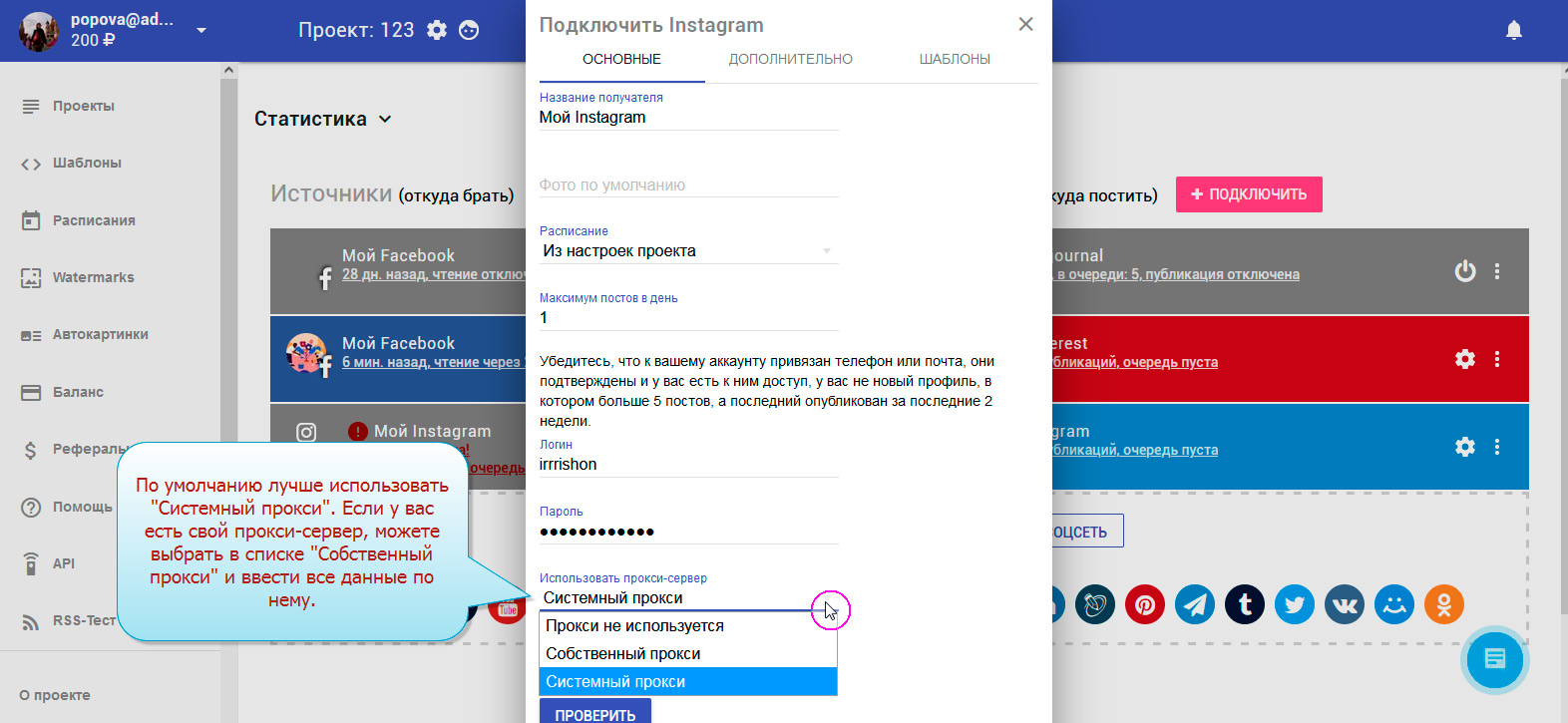 Всю инструкцию по подключению аккаунта Instagram* в приёмники можно просмотреть здесь картинках по этапам: